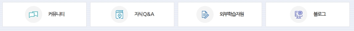 2. 첫 번째 메뉴로 커뮤니티, 지식 Q&A, 외부학습지원, 블로그가 있습니다. 이 메뉴들은 학습자들 간의 소통을 돕고, 학습 중 궁금한 점을 질문하거나 추가 자료를 찾아볼 수 있는 공간을 마련해줍니다. 학습 과정에서 생긴 질문들은 이곳에서 해결할 수 있어요.