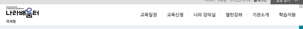 1. 국세청 나라배움터 홈페이지에 접속했습니다. 여기는 국세청 소속 직원들이 교육을 받을 수 있는 플랫폼으로, 다양한 교육 과정을 제공하고 있습니다. 나라배움터는 온라인 학습을 지원하며, 교육 일정 확인과 수강 신청, 학습 지원 서비스 등을 제공하는 곳입니다.