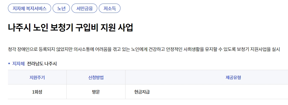 6. 나주시를 예를들어서 클릭해보면 각 지자체에서 보청기 지원을 하는 곳들이 있고, 일부는 현재 지원 기간이 아닐 수도 있습니다. 지원 여부는 기간별로 달라질 수 있어요. 그래서 정확한 정보는 본인이 살고 있는 시군구청에 직접 문의해보는 것이 가장 빠른 방법이에요. 공지나 기간이 변경될 수 있으니 한 번쯤은 확인해보시는 게 좋을 것 같습니다.