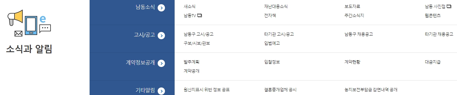 6. 홈페이지에서 남동구의 소식을 빠르게 접할 수 있어요. 최신 뉴스는 물론이고 각종 공고, 입찰 정보, 계약 현황까지 투명하게 공개돼 있어요. 남동구청에서 진행하는 주요 행사나 주민들을 위한 공지 사항도 확인할 수 있어, 필요한 정보를 놓치지 않고 챙길 수 있습니다. 주간 소식지나 남동구TV 같은 콘텐츠도 제공되어 있어 구민들이 다양한 방식으로 정보를 접할 수 있는 점이 매력적입니다.