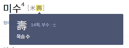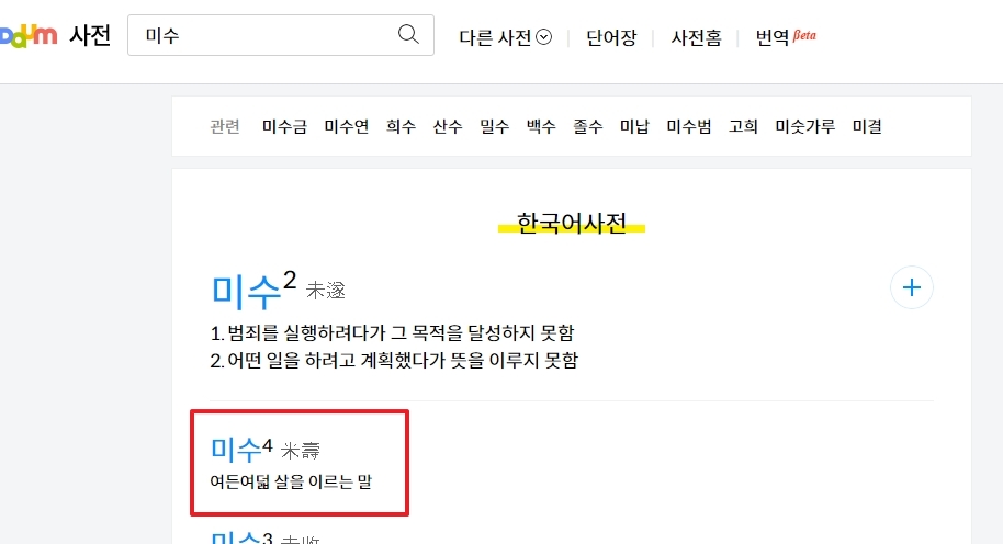 2. 검색창에 미수를 입력한 후 결과를 확인합니다. 미수는 한국어에서 88세를 의미하는 단어로, 88이라는 숫자 자체가 한자 쌀 미(米)에서 유래된 것이 독특합니다. 이는 전통적인 나이 기념 방식 중 하나로, 한국의 특별한 나이 지칭 문화의 일부입니다.