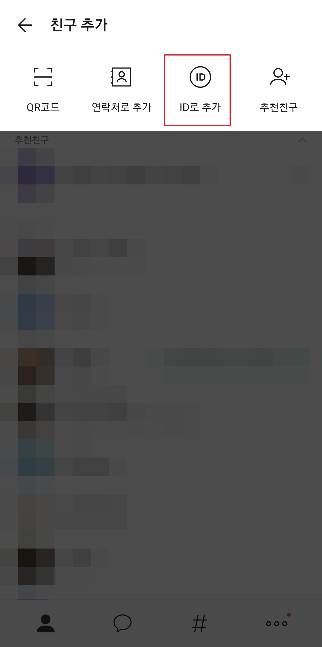 8. ID로 추가하여 친구를 찾는 방법입니다. 이 또한 친구가 해당 ID를 등록하고 검색 허용을 했을 경우에만 가능합니다.