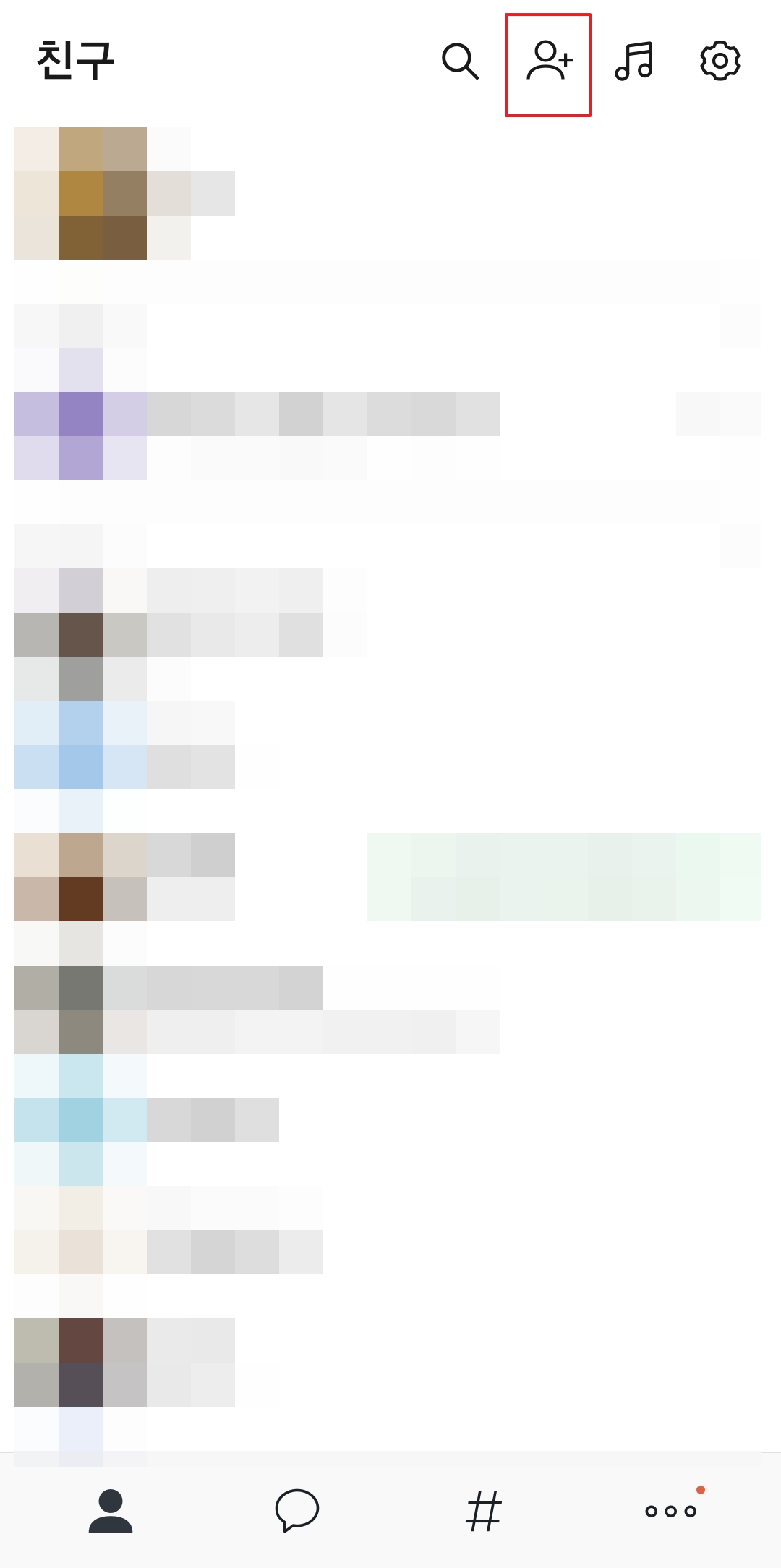 좌측 하단의 사람 모양 친구 버튼을 클릭한 후, 우측 상단의 돋보기 모양 아이콘을 클릭합니다.