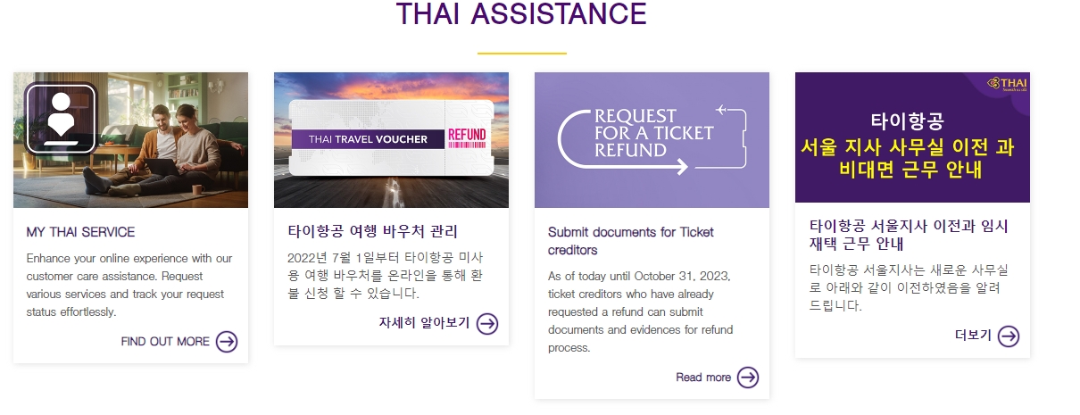4. 여행 중 불편 사항이 생겼을 때도 타이항공은 빠른 고객 지원을 제공합니다. 다양한 문의 사항은 ‘My Thai Service’를 통해 해결할 수 있고, 추가 요청이나 변경 사항이 있으면 온라인 상에서 빠르게 처리할 수 있어요.