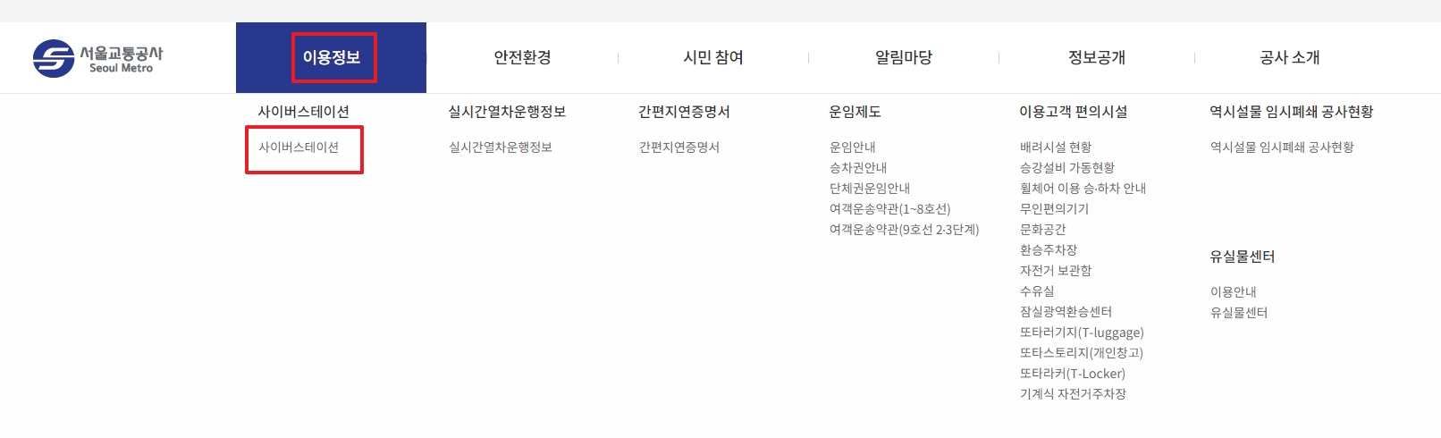2. 상단 메뉴에서 이용정보를 선택한 후 사이버스테이션으로 이동했습니다. 이곳에서 각 지하철역에 대한 정보를 자세히 볼 수 있고, 경로 검색 등 다양한 기능을 사용할 수 있습니다.