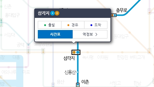 5. 삼각지역과 같은 특정 역을 선택하면 해당 역의 시간표와 역 정보를 바로 확인할 수 있습니다. 출발, 경유, 도착 정보를 실시간으로 제공해 지하철을 이용하는 데 큰 도움이 됩니다.