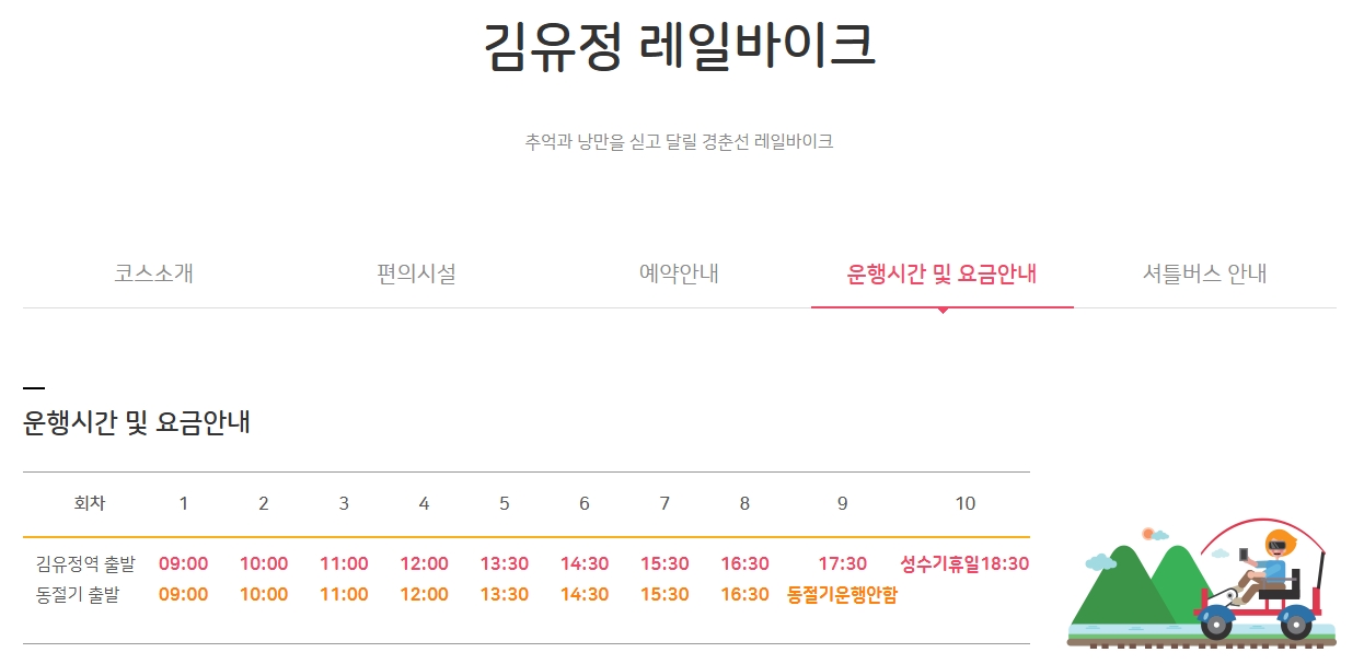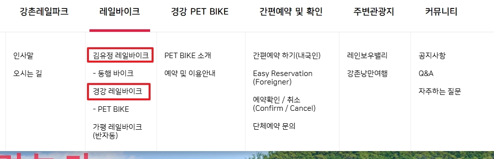 - 메뉴 항목: 김유정 레일바이크, 동행 바이크, 경강 레일바이크, PET BIKE, 가평 레일바이크(반자동).