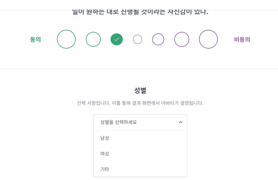 6. 질문을 완료하고 나면 성별을 선택하거나 선택하지 않고 검사 결과를 확인할 수 있습니다. 성별 선택은 검사 결과에 큰 영향을 미치지 않아요.