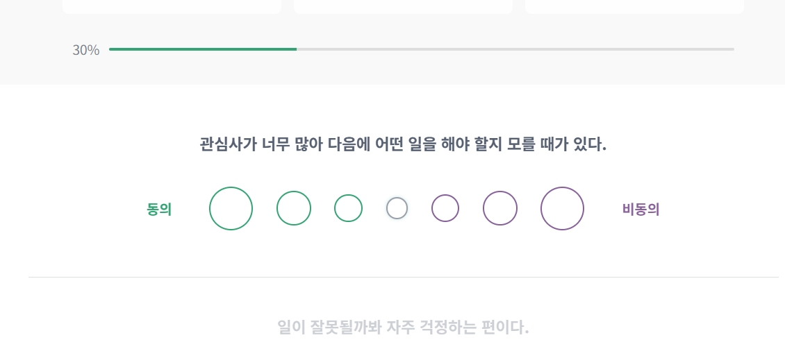 7. 검사는 약 50개의 질문으로 구성되며, 진행 상황은 상단에 퍼센트로 표시됩니다. 질문 수가 많지만 비교적 빠르게 진행됩니다.