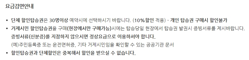 - 할인탑승권과 단체 할인은 중복 적용되지 않습니다.