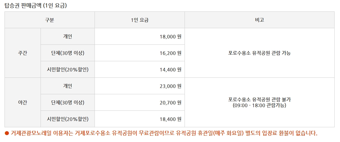 - 거제시민 할인은 현장 구매만 가능하니, 탑승 당일 신분증을 꼭 지참하세요.