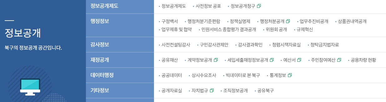 5. 정보공개 메뉴에서는 구청에서 공개하는 각종 정보들을 열람할 수 있어요. 행정정보부터 재정공개까지 투명하게 제공되고 있어, 주민들이 구정 운영을 더욱 신뢰할 수 있는 근거가 된답니다. 궁금한 정보는 여기서 한눈에 확인할 수 있어요.