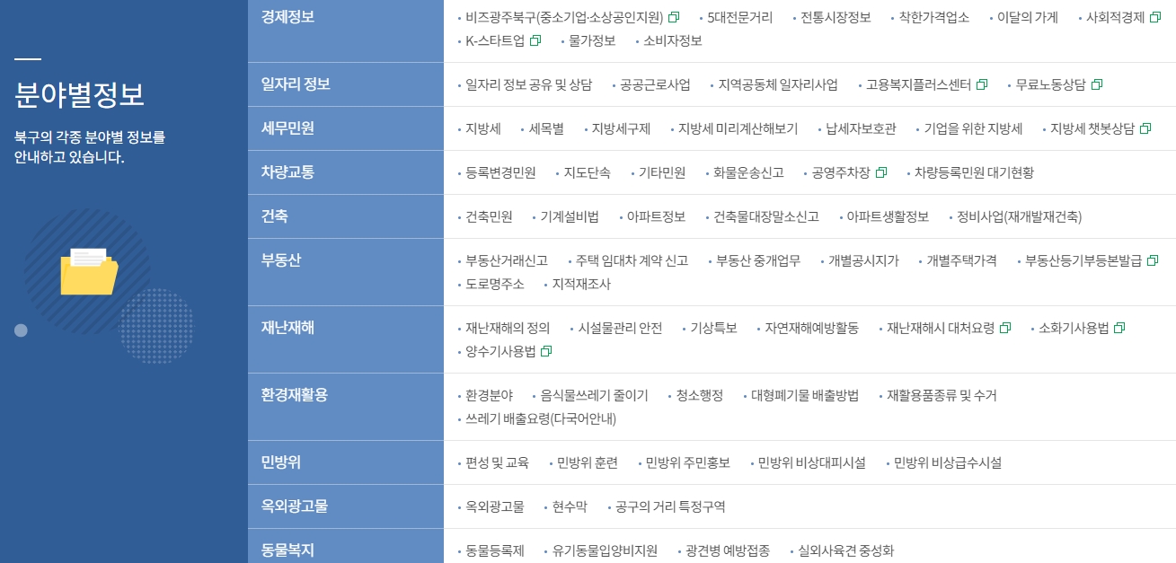 8. 북구 소개 메뉴에서는 지역에 관한 전반적인 정보를 제공해요. 행정조직 안내부터 구정 관련 계획까지 구청이 어떻게 운영되고 있는지 쉽게 파악할 수 있어요. 또한, 북구 내의 주요 시설들에 대한 정보도 제공하여 지역 사회에 대한 이해도를 높일 수 있답니다.
