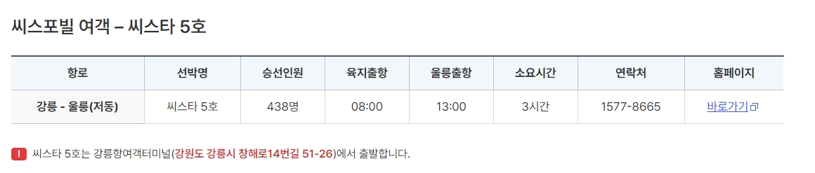 4. 강릉에서 울릉도로 가는 배편 중 하나인 씨스타 5호의 정보입니다. 이 배는 강릉항에서 오전 8시에 출항하며, 약 3시간 후인 오후 1시경 울릉도에 도착하게 돼요. 승선 인원은 총 438명으로, 강릉항 여객터미널에서 출발합니다. 여름 성수기나 기상 상황에 따라 운항이 조정될 수 있으니, 출발 전 미리 확인하는 것이 중요하답니다.