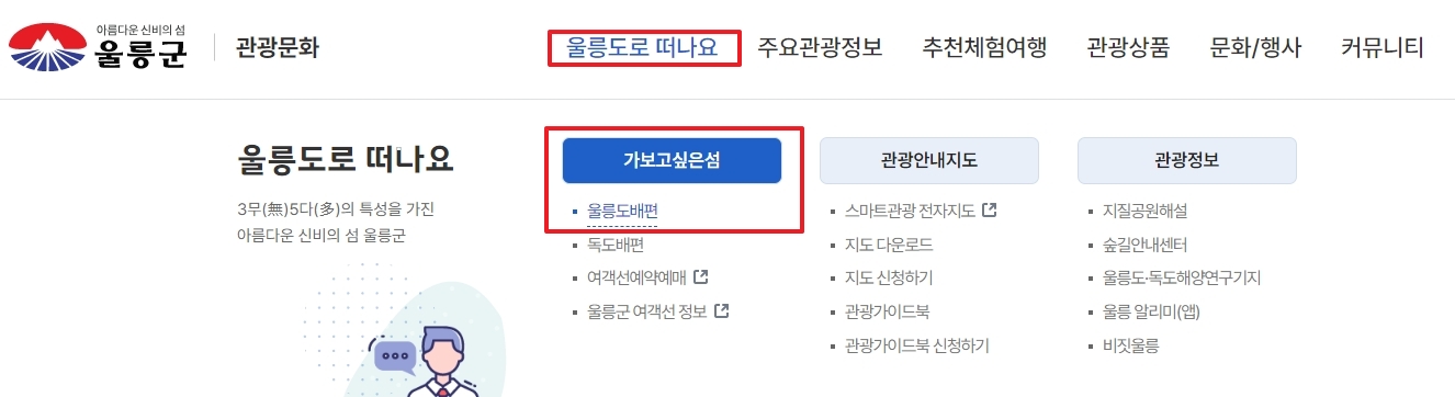 2. 상단의 메뉴를 보면 ‘울릉도로 떠나요’라는 항목이 있어요. 여기에서 ‘가보고 싶은 섬’ 메뉴로 들어가면 울릉도 배편 정보와 함께 울릉도 여행의 특별한 매력을 발견할 수 있답니다. 이곳에서는 울릉도의 숨은 명소들을 비롯해, 울릉도를 좀 더 색다르게 경험할 수 있는 팁들도 소개하고 있어요. 메뉴 구성이 직관적이라 처음 접하는 사람도 쉽게 이용할 수 있어요.