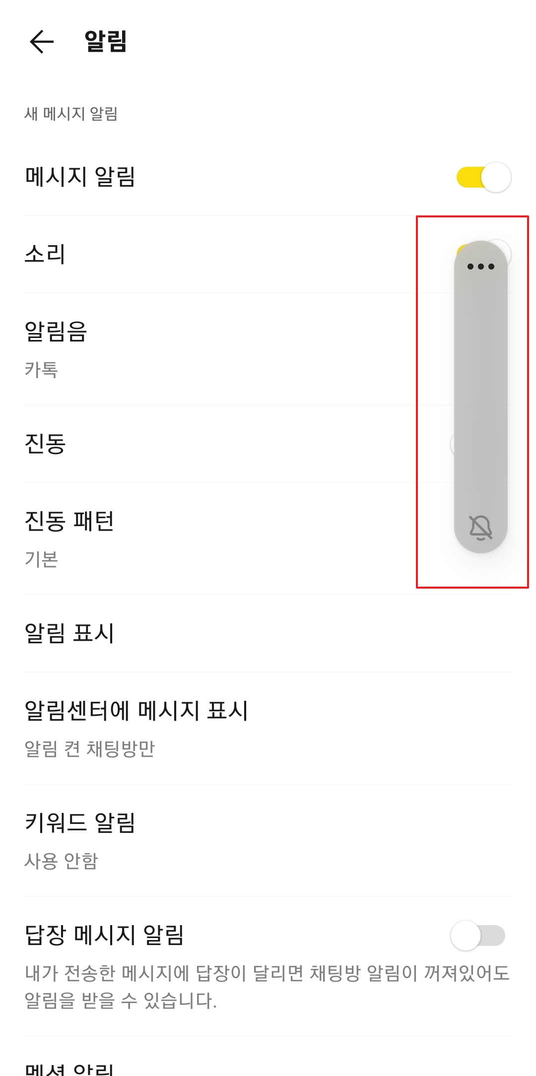 3. 카카오톡 알림음이 들리지 않는다면, 새 메시지 알림 부분을 확인해야 합니다. 메시지 알림이 꺼져 있으면 소리, 진동, 알림창이 모두 뜨지 않아요. 이 경우, 메시지 알림을 켠 후 소리 설정도 함께 켜주세요. 사진처럼 꺼져 있는 상태에서 소리 설정을 활성화하는 것이 중요합니다.