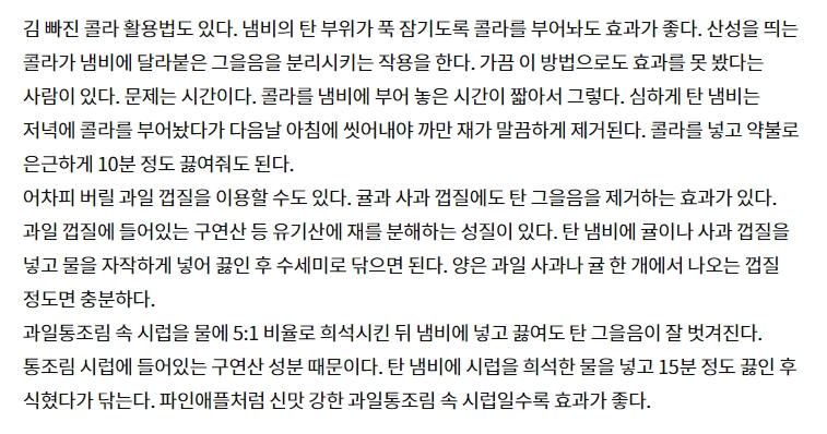 6. 마지막으로, 김이 빠진 콜라를 활용하는 방법도 있습니다. 콜라의 인산이 탄 부분을 부드럽게 만들어 줍니다. 탄 냄비에 콜라를 부어 끓여주면, 의외로 깨끗해지는 효과를 경험할 수 있습니다. 이와 비슷하게 과일 통조림의 국물도 활용할 수 있으며, 이들 모두가 자연적인 세척제로 작용합니다.