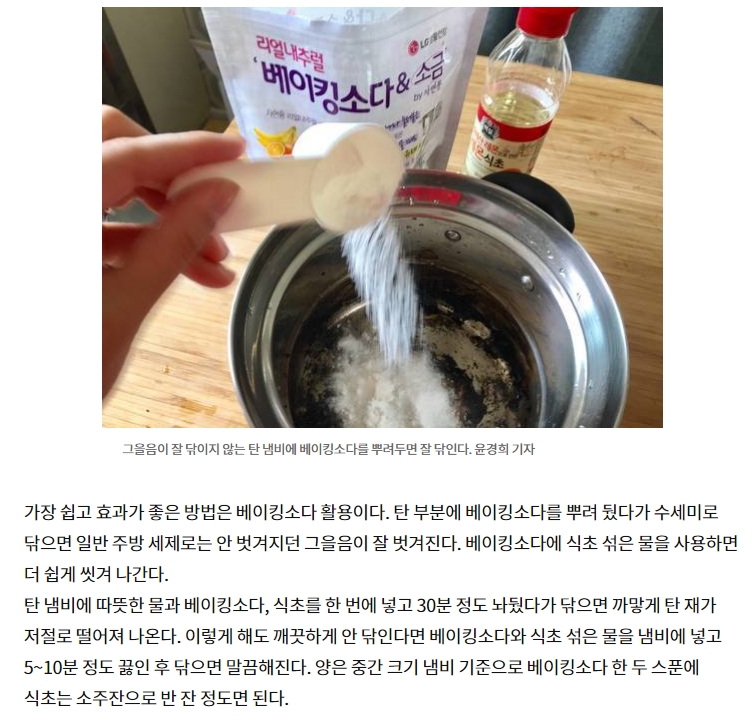 1. 베이킹소다와 식초 활용하기 먼저, 베이킹소다를 탄 부분에 충분히 뿌린 후 물과 식초를 1:1 비율로 섞어 부어주세요. 이 상태로 잠시 두면 화학 반응을 통해 탄 자국이 부드러워져요. 몇 분 후에 부드러운 수세미로 문질러 닦아주면 탄 부분이 쉽게 제거돼요. 베이킹소다와 식초는 친환경적이고 세정력이 뛰어나기 때문에 많이 사용됩니다.