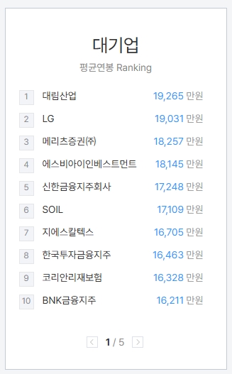 4. 대기업 연봉 순위에서는 대림산업과 LG가 높은 연봉을 제공하며 상위권을 차지합니다. 대기업에서는 1억 원 이상의 연봉을 제시하는 회사도 많아, 취업 준비생들에게 매력적인 선택지가 됩니다.