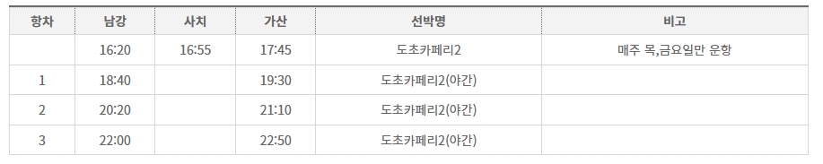 5. 남강에서 가산까지의 야간 배편은 목요일과 금요일에만 운행됩니다. 이 시간표에 따르면 오후 6시 40분부터 자정까지 네 편의 배가 운영되며, 심야시간까지 배를 이용할 수 있어요. 이 코스는 주말 방문객들에게 인기가 많아 예약이 필수인 경우도 있습니다.