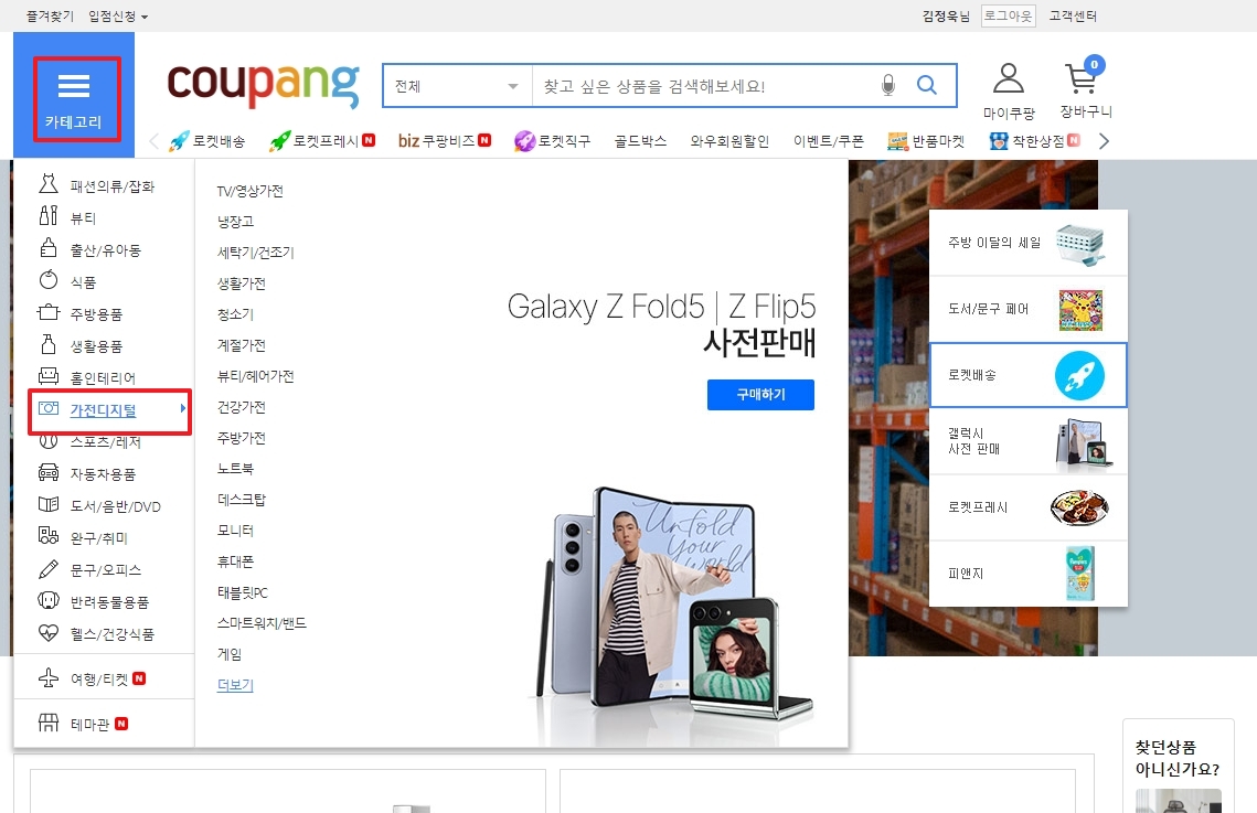 2. 좌측의 카테고리에 마우스 커서를 올리면 여러 가지 카테고리가 펼쳐집니다. 그중 ‘가전·디지털’ 항목을 클릭하면 냉장고, TV, 세탁기, 전자레인지 등 다양한 가전제품을 쉽게 찾아볼 수 있습니다. 이를 통해 자신의 필요에 맞는 제품을 빠르게 선택할 수 있습니다.
