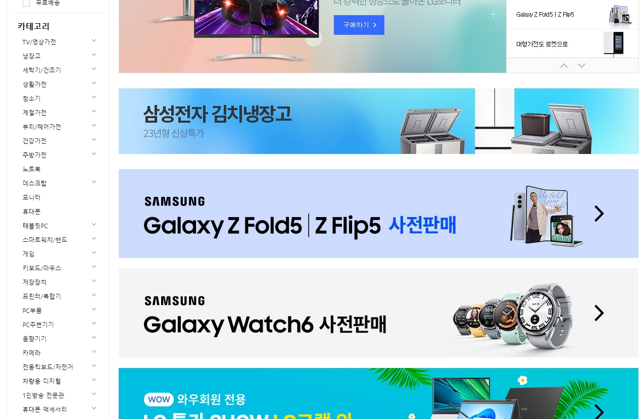 5. 냉장고 카테고리에서는 3도어, 4도어, 양문형, 김치냉장고 등 다양한 유형으로 나뉘어 있어 소비자들이 자신의 생활 패턴에 맞는 제품을 선택할 수 있습니다. 와인냉장고와 같은 특수 용도 제품도 제공되어 특별한 니즈를 가진 사용자에게도 만족스러운 선택지를 제공합니다.