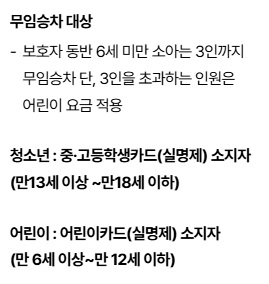 특히 무임승차 대상에는 보호자가 동반하는 6세 미만 소아 3인까지 무료이며, 3인을 초과하는 경우 어린이 요금이 적용됩니다. 청소년과 어린이 요금은 실명제 카드 소지자에 한해 적용되므로 카드를 지참하는 것이 필요합니다.