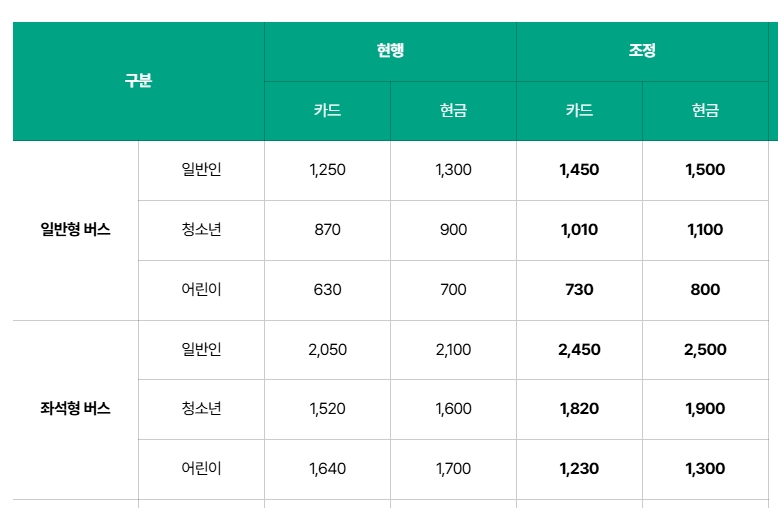 일반형 버스 요금은 카드 사용 시 일반인이 현행 1,250원에서 1,450원으로, 현금 결제 시 1,300원에서 1,500원으로 인상됩니다. 청소년 요금은 카드로 870원에서 1,010원으로, 어린이 요금은 630원에서 730원으로 각각 오르며, 현금을 사용할 경우에는 각 요금이 약간 더 높아집니다.
