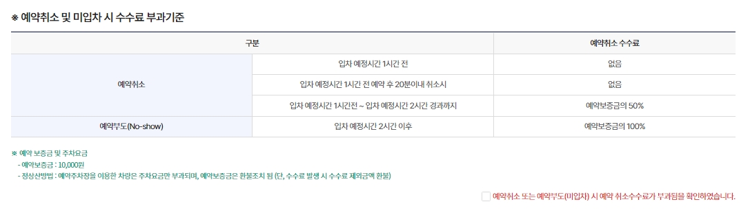 9. 주차 요금과 예약 시 필요한 보증금이 안내됩니다. 예약 시 보증금을 미리 납부하고, 주차장 이용 후 일정 부분이 환불될 수 있습니다. 주차 요금 체계와 환불 조건을 미리 확인하여 계획된 예산을 관리하는 데 도움이 됩니다. 여행 경비에 포함된 주차 비용도 알뜰히 관리하세요.