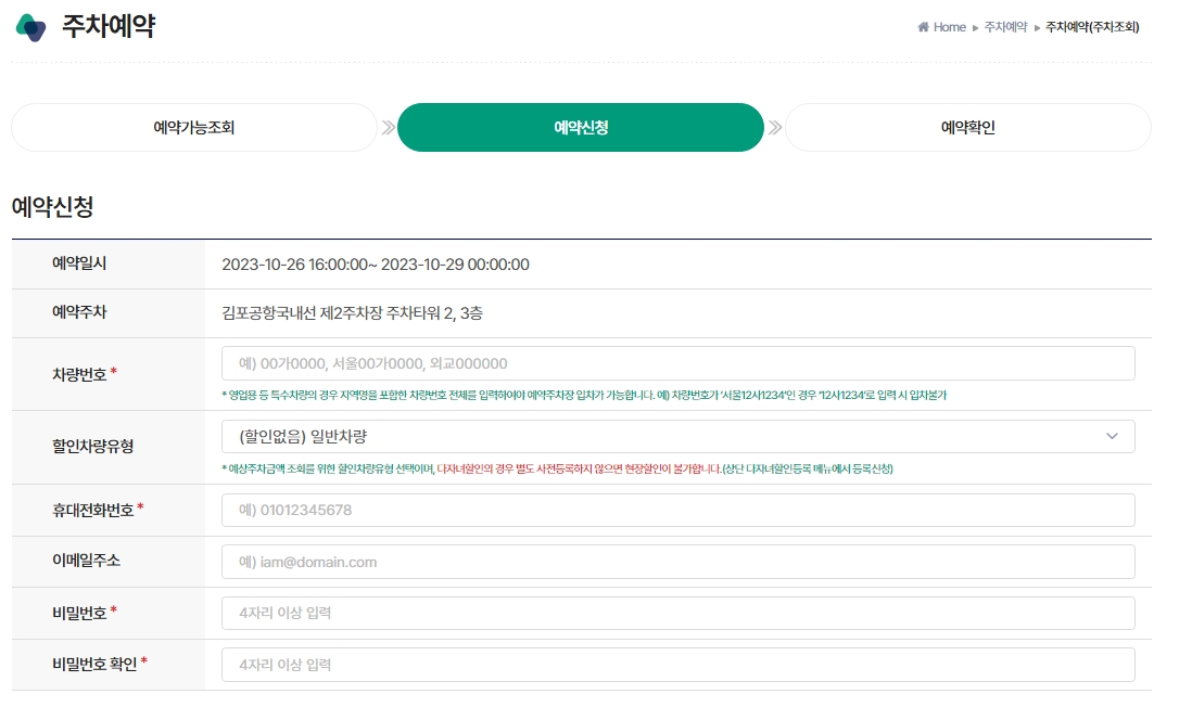 8. 이제 차량 번호와 연락처, 이메일 주소 등 필요한 정보를 입력하여 예약을 완료합니다. 예약 확인에 필요한 정보이니 정확히 입력해야 합니다. 이 정보는 나중에 예약 확인이나 변경 시에도 필요할 수 있습니다. 주차장 입구에서 예약 정보만 간단히 보여주면 편리하게 이용할 수 있습니다.