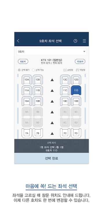 6. 좌석 선택이 완료되면 좌석 정보를 다시 한번 확인할 수 있어요. 창가 자리, 복도 자리 등 다양한 옵션을 제공하며, 기차 안에서 최적의 자리를 확보할 수 있습니다. 최적의 조건으로 좌석을 예약하여 편안한 여행을 즐길 수 있도록 돕습니다.