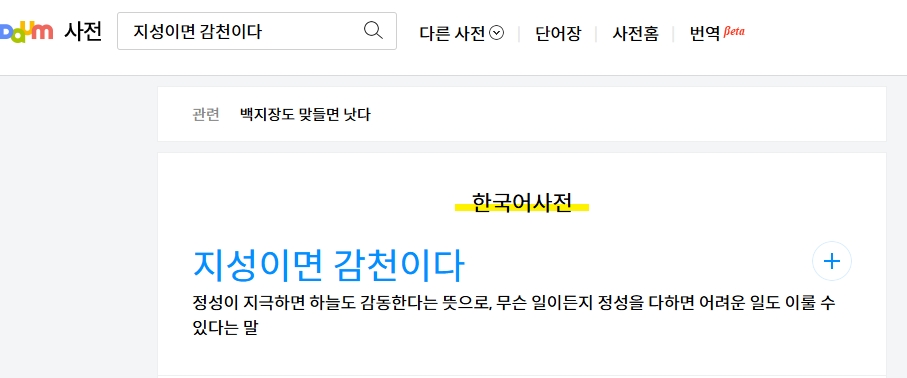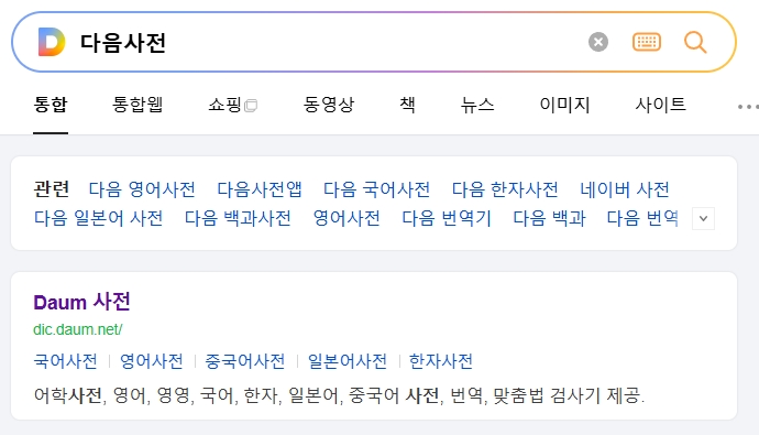 1. 다음 사전으로 들어갑니다. 이곳은 한국어 어휘의 뜻과 사용 예시를 확인할 수 있는 사이트로, 사전뿐만 아니라 번역 기능도 제공하여 다양한 언어로 단어의 의미를 파악할 수 있게 도와줍니다. 특히 한국어 사전에서는 속담, 고사성어, 관용구 등도 찾아볼 수 있습니다.