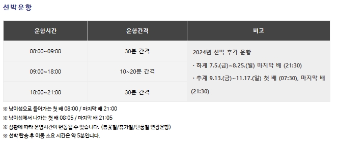 3. 운행 간격과 특별 운항에 대한 정보를 확인합니다. 성수기 하계 기간(7월 5일부터 8월 25일까지)과 추석 기간(9월 13일부터 11월 17일까지)에는 첫 배가 아침 7시 30분에 출발하며, 마지막 배는 21시 30분에 출발합니다. 남이섬을 방문할 때는 배를 타기 전 5분 정도의 대기 시간이 있을 수 있으며, 날씨와 같은 외부 조건에 따라 시간표가 변동될 수 있으니 사전 확인이 필수입니다.