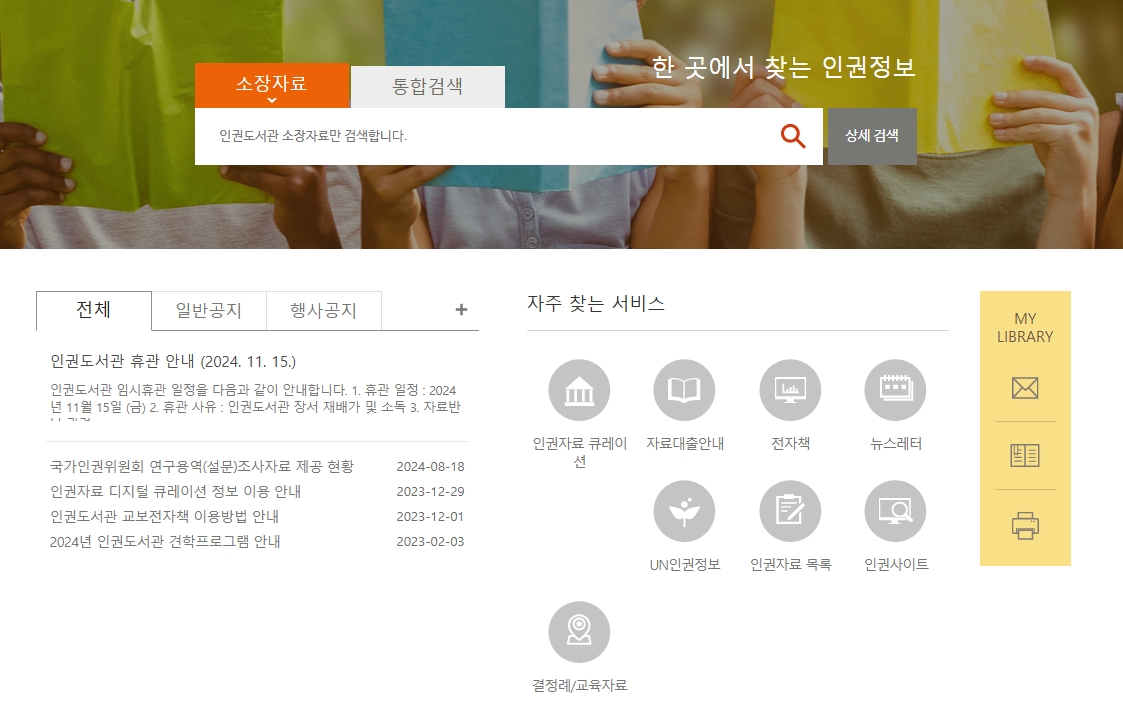 6. 인권도서관 페이지로 이동하여 인권 자료를 열람할 수 있습니다. 이곳에서는 인권 관련 서적과 자료를 대출할 수 있으며, 인권 자료 큐레이션 서비스도 제공됩니다. 또한, 전자책 열람이나 인권 관련 뉴스레터 구독도 가능하며, UN 인권 정보나 국내외 인권 관련 자료들을 쉽게 찾아볼 수 있는 시스템이 마련되어 있어, 누구나 인권에 대한 정보를 손쉽게 접근할 수 있습니다.