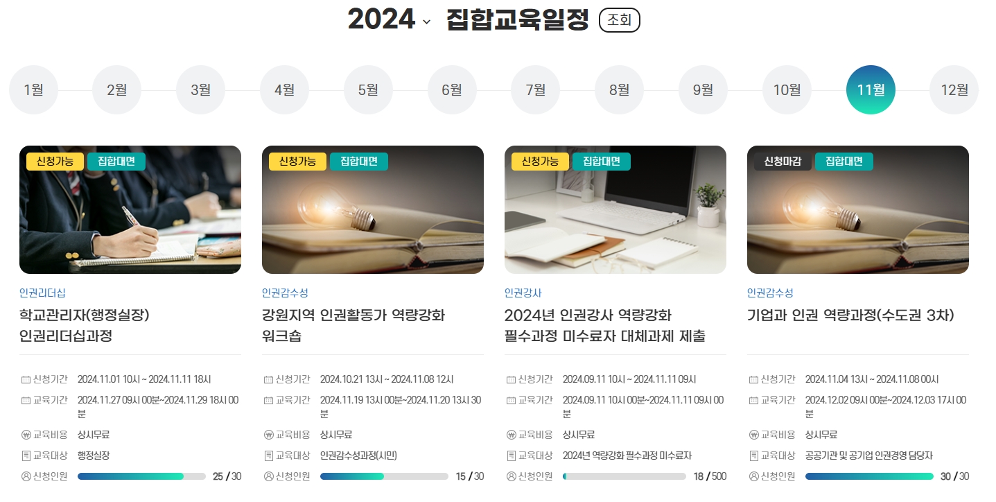 5. 인권 관련 행사 일정과 소식을 확인할 수 있습니다. 2024년에는 여러 집합 교육 과정이 예정되어 있으며, 학교 관리자나 인권 활동가, 기업과 공공기관을 대상으로 하는 교육 프로그램이 진행됩니다. 각 교육 프로그램의 일정과 신청 방법이 상세히 안내되어 있으며, 인권 증진을 위한 다양한 강좌가 제공됩니다.