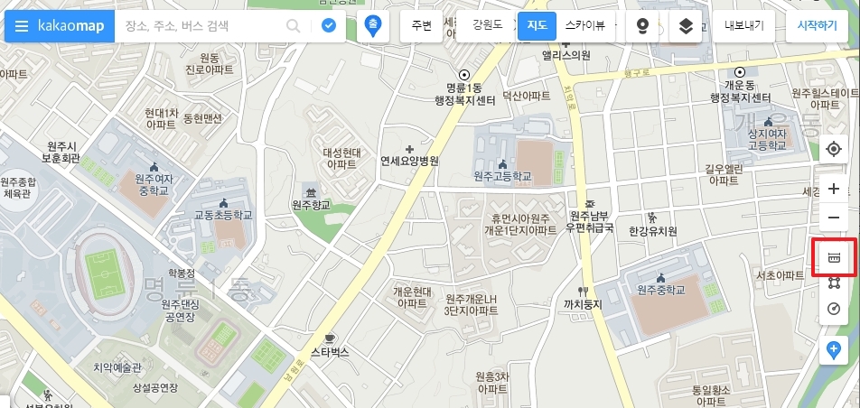 3. 거리 재기를 시작하려면, 지도 화면 우측에 위치한 자 모양 아이콘을 클릭합니다. 이 아이콘을 클릭하면 거리 측정 모드로 전환되어 원하는 지점 간의 거리를 쉽게 측정할 수 있습니다.
