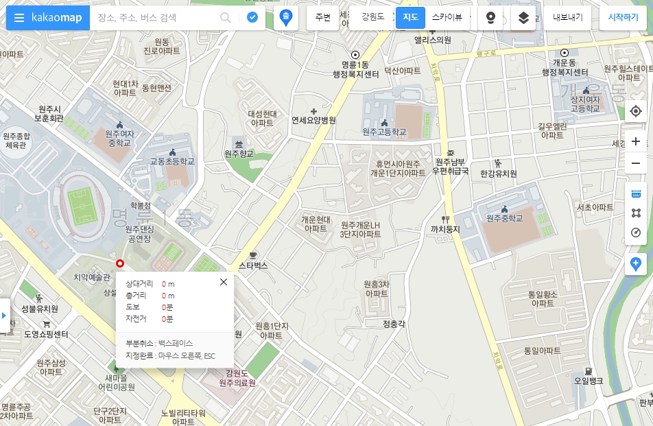 6. 마지막 지점을 클릭한 후 측정을 종료하려면, 마우스 오른쪽 버튼을 클릭하거나 키보드의 ESC 키를 누르면 됩니다. 이를 통해 자유롭게 측정한 경로의 총 거리를 확인할 수 있습니다. 지도 상에 빨간 선으로 표시된 경로가 측정한 거리입니다.