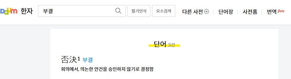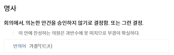 2. 검색창에 부결을 입력하면 부결의 정의와 상세한 의미가 나타납니다. 부결은 회의에서 의논된 안건을 승인하지 않기로 결정하는 것을 의미하며, 특정 안건이 통과되지 않고 거부된 경우를 뜻합니다.
