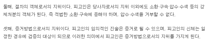 5. 피고인은 형사소송에서 세 가지 주요 지위를 가집니다. 첫 번째는 ‘당사자로서의 지위’로, 이는 피고인이 소송의 주체로서 검사와 대등하게 소송을 수행하는 위치에 있음을 의미합니다. 이 지위는 피고인에게 공평한 재판을 받을 권리와 함께, 검찰 측의 주장에 대해 반론을 제기할 수 있는 권리를 제공합니다. 두 번째 지위는 ‘절차의 객체로서의 지위’로, 피고인은 필요한 경우 법원의 강제력에 의해 소환되거나 구속될 수 있는 의무를 가지며, 재판 절차에 적법하게 참여해야 합니다. 세 번째 지위는 ‘증거방법으로서의 지위’로, 피고인의 진술이나 증언이 중요한 증거로 사용될 수 있으며, 이는 피고인의 진술이 재판에서 중요한 역할을 한다는 의미를 갖습니다.