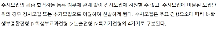 예를 들어, 수시는 학생부 교과 성적을 기반으로 한 교과 전형, 학생부와 자기소개서를 종합 평가하는 종합 전형, 논술 성적을 중심으로 하는 논술 전형, 특정 재능이나 자격을 보는 특기자 전형 등 여러 종류로 나뉩니다. 이러한 전형들은 학생들의 다양한 학업과 활동 경험을 반영하려는 대학의 의도가 담겨 있어, 학생들은 자신의 강점을 살릴 수 있는 전형을 선택해 지원할 수 있습니다. 수시 전형은 여러 차례 지원 기회를 제공하기 때문에, 학생들이 본인의 학업 기록이나 활동에 맞춰 다양한 방식으로 대학에 지원할 수 있는 기회를 넓혀 줍니다.
