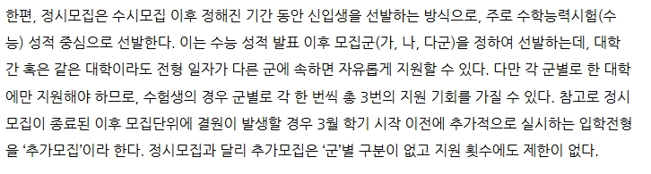 5. 정시모집은 수시모집 이후 일정 기간 동안 수능 성적을 기반으로 신입생을 선발하는 방식입니다. 정시모집에서는 수능 성적이 주요 평가 요소가 되며, 가·나·다군으로 구분하여 지원이 이루어집니다. 대학 간에는 모집 군이 다를 수 있어, 지원자는 자신의 성적과 희망 대학에 맞추어 유리한 모집 군을 선택하여 지원할 수 있습니다.