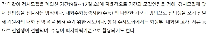 3. 수시모집은 각 대학이 정시모집을 제외한 기간(주로 9월부터 12월 초)에 자율적으로 모집 일정을 정하여 신입생을 선발하는 방식입니다. 수시모집에서는 학생부, 대학별 고사, 서류 등이 주요 전형 요소로 활용되며, 대학별로 요구하는 자격 요건과 평가 방식이 다를 수 있습니다. 수능 성적은 최저 학력 기준으로만 활용되기도 하며, 정시와는 다른 방식으로 지원자에게 기회를 제공합니다.