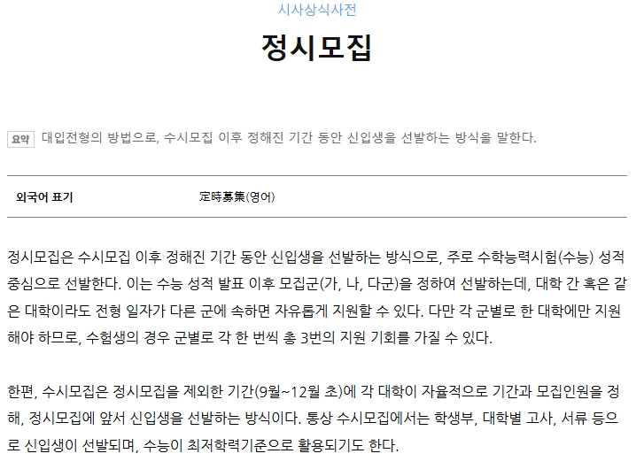 이처럼 수시는 특정 상황에 구애받지 않고 유연하게 대처하는 의미로 쓰이며, 입시에서는 정시와 대비되는 개념으로 활용되고, 일반적으로는 필요에 따라 언제든지 상황에 맞게 대응한다는 뜻으로 널리 사용됩니다.