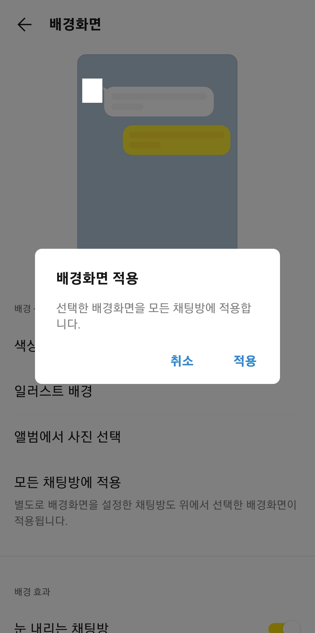 9. 모든 채팅방 적용 옵션을 선택하면 설정한 배경화면이 모든 채팅방에 동일하게 적용됩니다. 이렇게 하면 일관된 분위기를 유지하면서 편안한 환경을 조성할 수 있습니다.