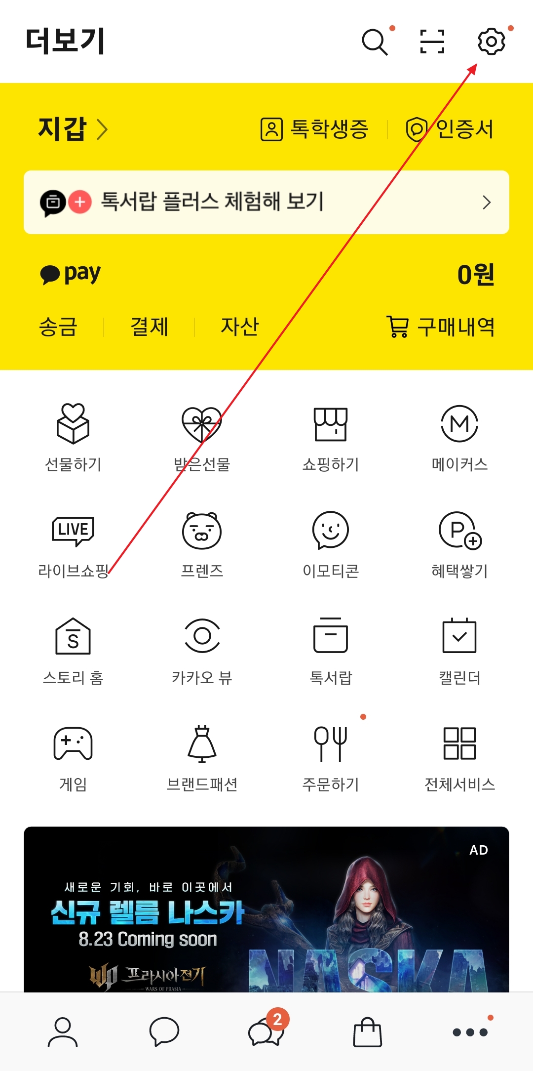2. 더보기 메뉴로 이동 후, 우측 상단에 위치한 톱니바퀴 모양의 설정 아이콘을 클릭합니다. 이 아이콘은 카카오톡의 다양한 사용자 설정 옵션을 제공하는 곳입니다.