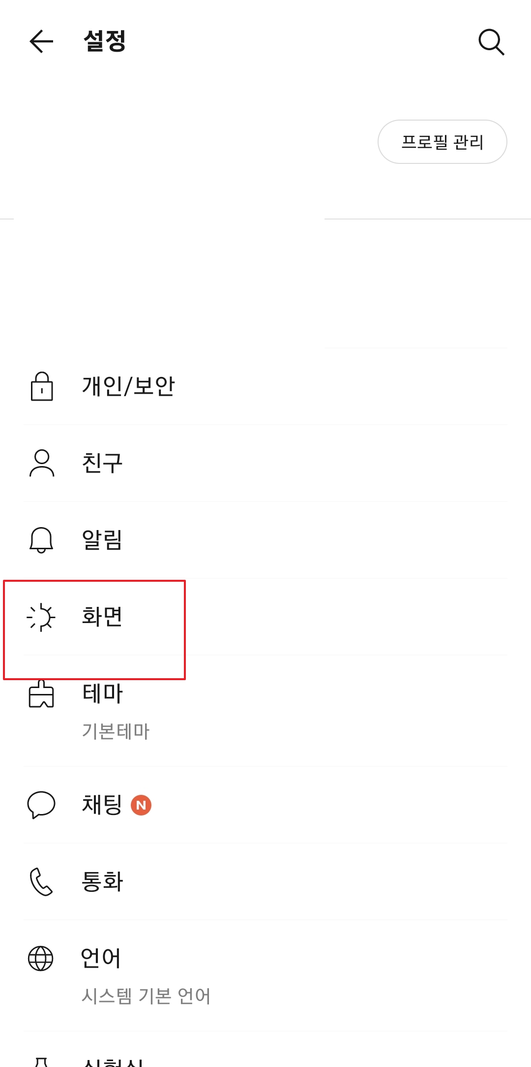 3. 설정 메뉴에서 가운데 부분의 화면 탭을 클릭합니다. 여기서 카카오톡의 배경화면과 관련된 모든 설정을 확인할 수 있습니다.