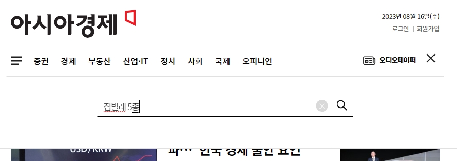 2. 아시아경제 홈페이지의 우측 상단 검색 버튼을 클릭하고 집벌레 5종을 검색합니다. 쌀벌레를 포함한 다양한 해충의 정보가 나오며, 그 중에서 쌀벌레에 대한 내용을 중점적으로 살펴볼 수 있습니다.