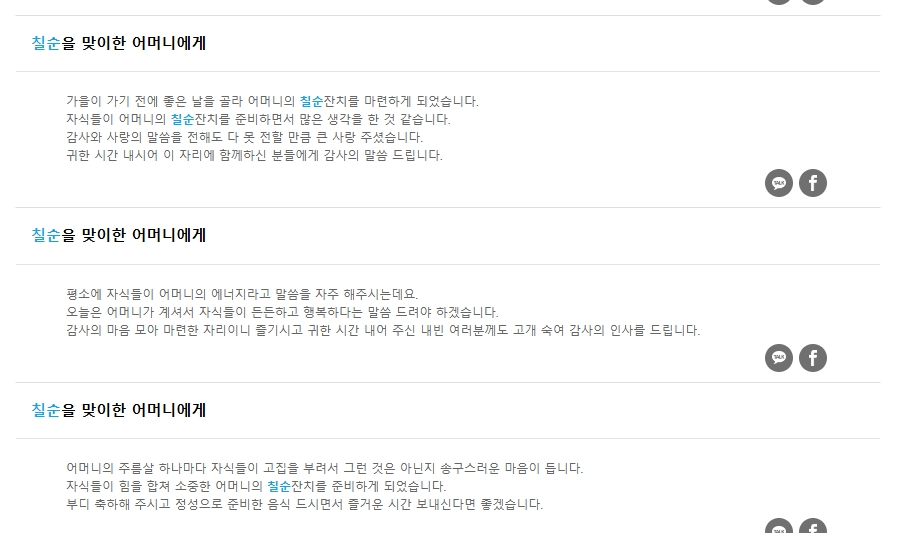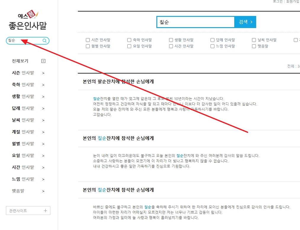 3. 축하 인사말 페이지로 이동한 후, 좌측 상단의 검색창에 ‘칠순’을 입력하고 검색합니다. 검색 결과에는 칠순 잔치 및 고희연과 관련된 인사말 예문들이 나타나며, 이를 통해 다양한 상황에 맞는 인사말을 참고할 수 있습니다.
