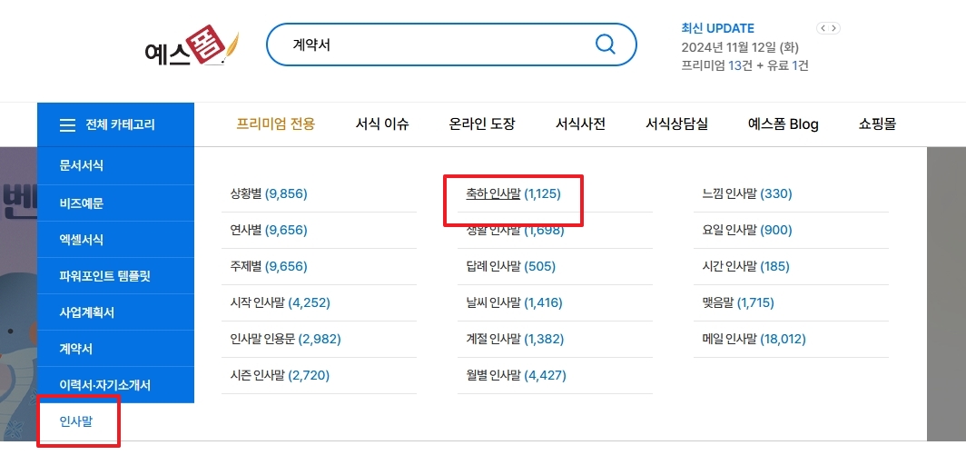 2. 좌측 상단의 메뉴에서 ‘인사말’ 카테고리를 클릭하고, 하위 메뉴에서 ‘축하 인사말’ 항목으로 들어갑니다. 이 항목에는 다양한 축하 인사말이 준비되어 있어, 행사나 기념일에 사용할 인사말을 쉽게 찾아볼 수 있습니다.