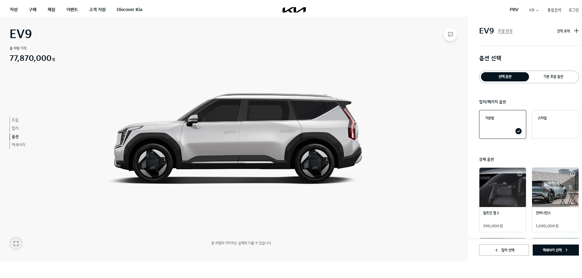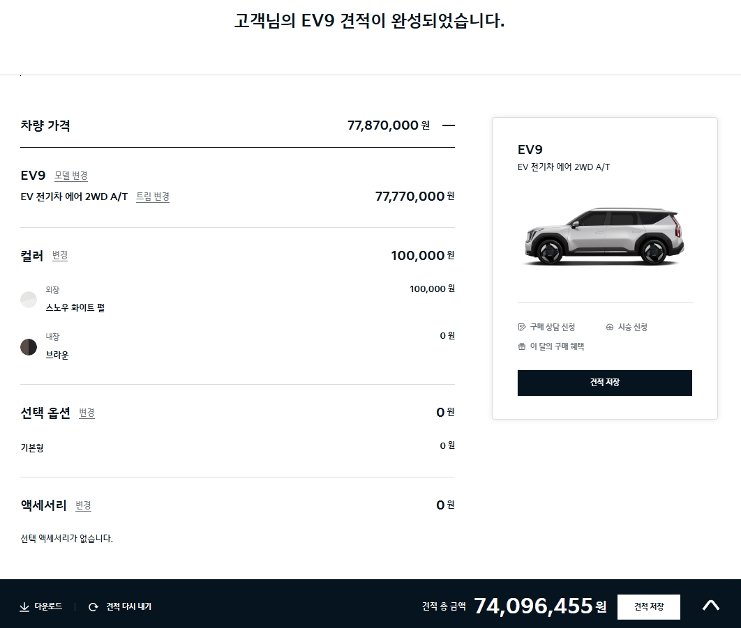 11. EV9의 최종 견적 페이지에서는 차량 가격, 선택한 트림과 옵션, 색상 및 액세서리의 총 금액을 확인할 수 있습니다. 사용자 맞춤형 차량 구성이 완료되며, 총 견적 금액이 표시됩니다. 구매 상담 신청과 시승 신청 버튼을 통해 구매 과정을 더욱 원활하게 진행할 수 있습니다.
